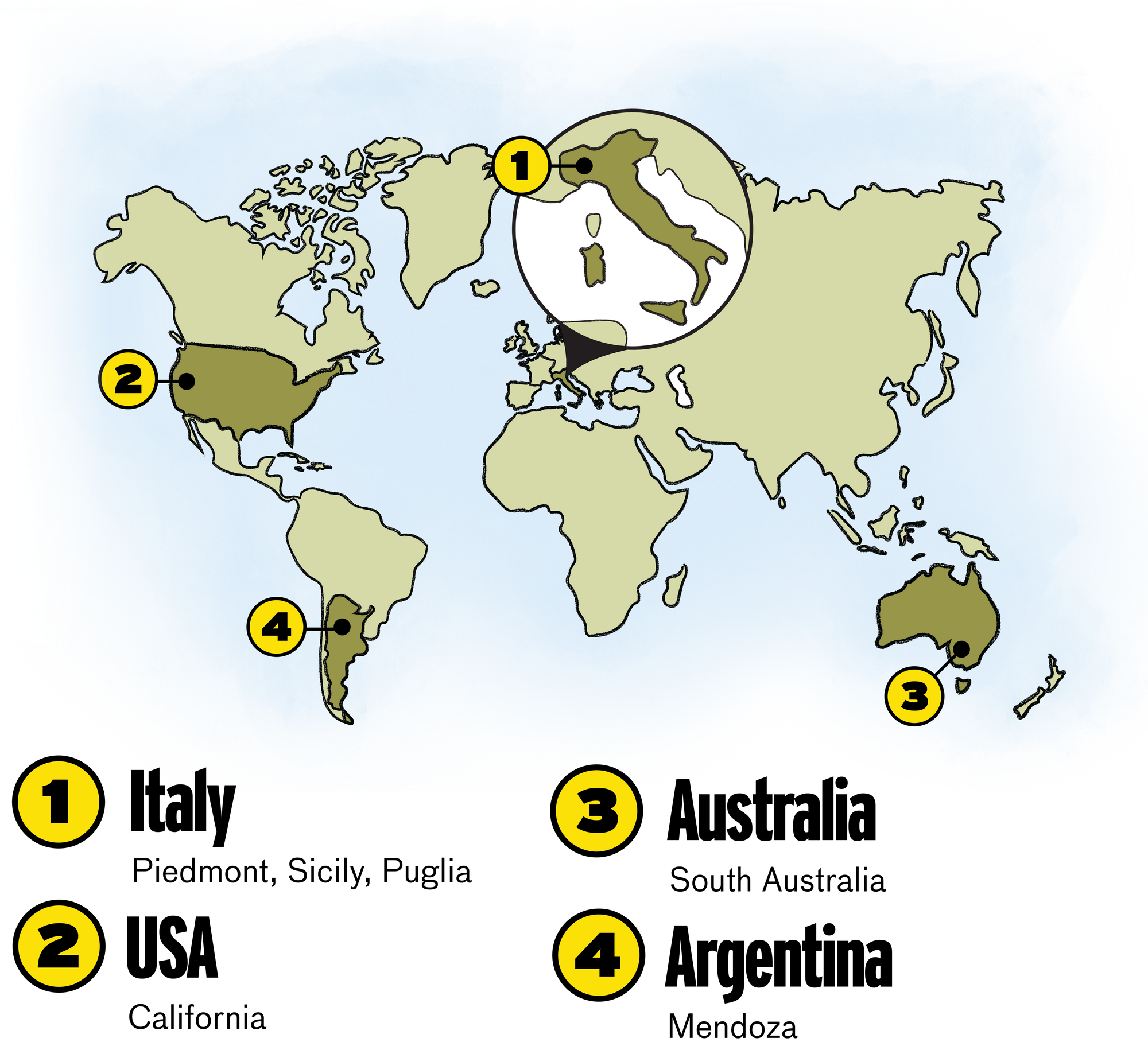 But! Century-old vines still exist in many Italian vineyards, producing long-ageing, robust wines with intense black cherry fruit, moderate alcohol and amplified tannins, with the best wines from vineyards around the towns of Asti and Alba in Piedmont, labelled Barbera d’Asti and Barbera d’Alba, and the Nizza DOCG denomination from Monferrato the most prized of all (these wines must be aged for at least two years before release). Many producers employ the use of oak or chestnut barrels for maturation, which provide increased complexity, ageing potential, and oaky flavours of spice and vanilla. And these wines you definitely do want to put away for a few years!