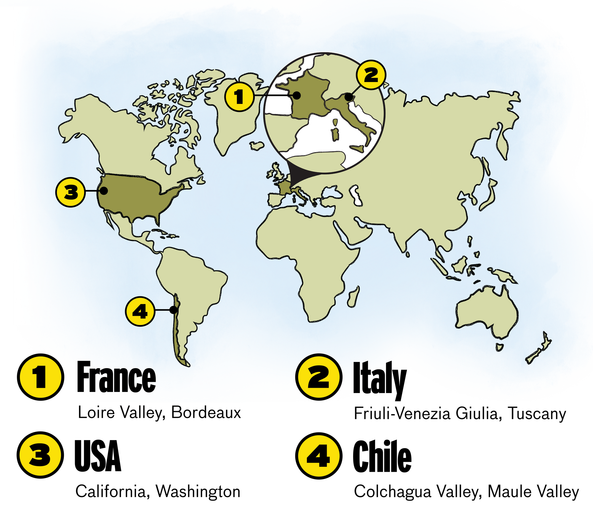 Cabernet Franc has found fame across the globe! It's particularly prized from the Loire Valley in France, but here you won't see "Cabernet Franc" on the label. Instead look for red wines with Loire Valley regional names like Saumur, Chinon or Bourgeuil — these are all Cab Franc!