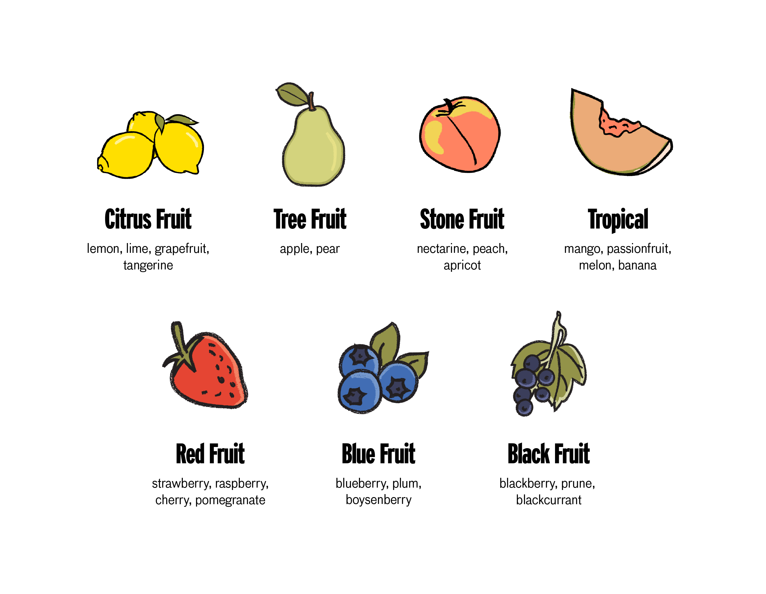 The descriptions can still be a bit flowery however, so we've broken them down into categories that help you imagine where the flavours of any given wine might lie.