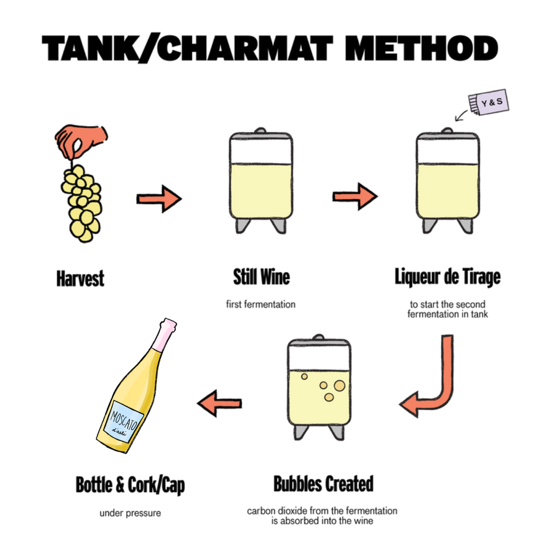 And the frizzante Moscatos? Unlike Champagne, whose bubbles are produced by secondary fermentation in its own bottle, Moscato goes through what is called the ‘Charmat Method’, which is a single tank fermentation, and bottled under pressure. This allows for a much speedier process, and importantly, for those lovely fresh and grapey aromatic qualities to be captured.