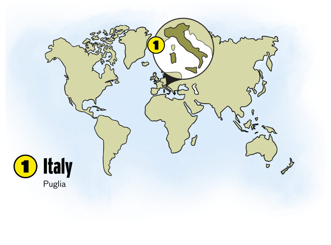 The eastern side of the Salento Peninsula in Puglia is Negroamaro ground zero, where the old bush vines make the best wines. Theoretically, the finest grapes also come from very close to the water, as the Mediterranean gives cooler nights (that enhances the luscious black flavours). So look for the wines almost touching the sea, and voila! Negoamaro goodness! Sure, Negroamaro doesn’t stray far from its Italian home, but there’s a smattering of the grape planted in Australia & California, where winemakers in the warmer regions love its heat and drought-resistant ways.