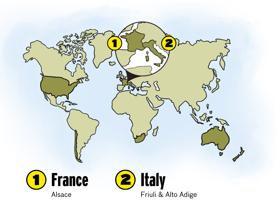 Just to muddy the water even more, Pinot Blanc is known as Pinot Bianco in Italy and Weissburgunder in Germany. The Austrians, bottling it as Weissburgunder, make the richest styles, where the grapes are sometimes picked very ripe and famously blended with the local Welschriesling to make luscious, juicy, sweet wines. Ol’ Pinot Blanc is more versatile than you think, as it’s also one of the accepted grapes in Champagne production (though very rare).