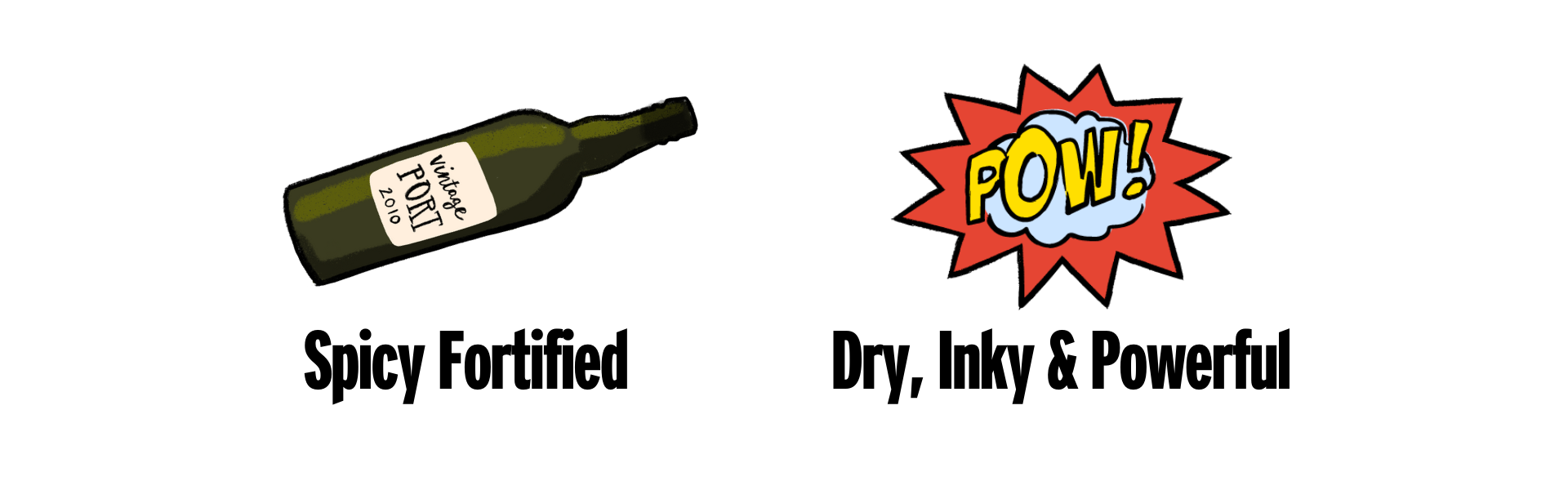 Touriga Nacional gained popularity as the main grape of Port, but these days you're just as likely to find it made as a dry wine. So the two best styles would be the complex, spicy fortified wines of Porto, and the complex, powerful and inky — seriously dense, purple, and teeth staining! — styles of the Douro Valley